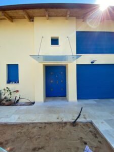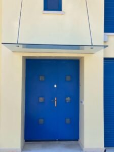 בזמן גשם, גגון הזכוכית של ד"ר זכוכית מאפשרים מבואה יבשה לפני דלת הכניסה.