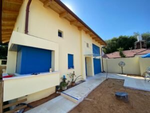 בחזית הבית מדבר בשפה אדריכלית מעודכנת ושומרים על מראה נקי וקל של החזית. הגגונים מצלילים ומגנים מפני פגעי מזג האוויר. דלתות הכניסה מוגנות מגשם עז וכן בהינתן זכוכית נכונה מפחיתים קרינת U.V, הגורמת לעץ נזקים רבים.